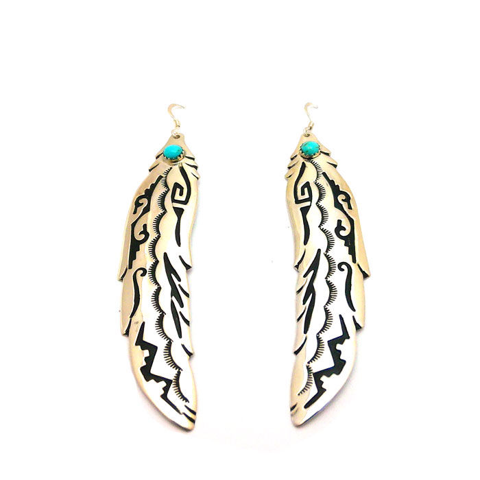 Sterling Silver Stamped Feather Earrings With Turquoise #FHE640