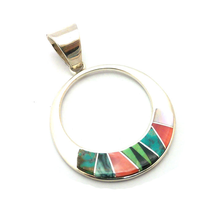 Colorful Inlay & Sterling Silver Navajo Round Pendant #AMP928