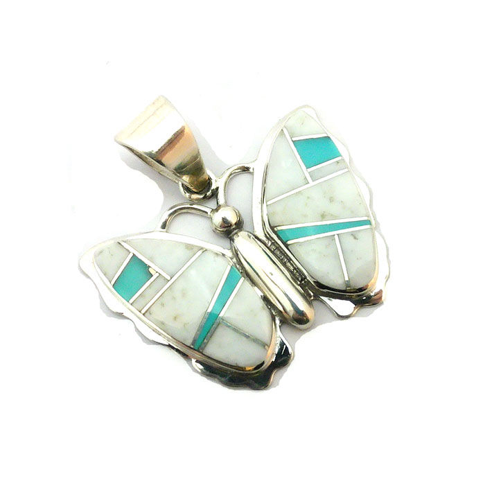 White Buffalo Turquoise & Black Jet Inlay Butterfly Pendant #ALB925