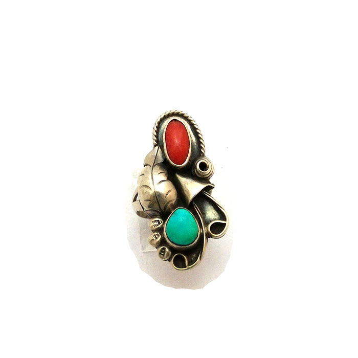 Vintage Navajo Red Coral & Turquoise Long Ring #VRB486